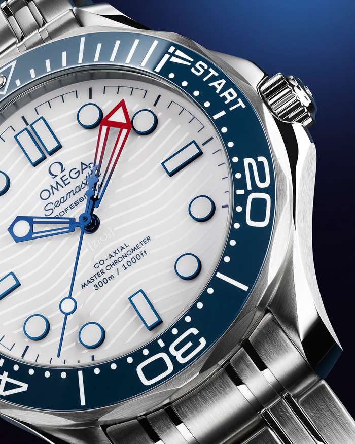 Die Seamaster Diver 300M mit 42 mm Durchmesser wurde aus Edelstahl gefertigt und besitzt eine einseitig drehbare Lünette aus blauer Keramik mit einer Regatta-Skala, die aus zwei 5-Minuten-Bereichen für den Countdown vor dem Start und einem START-Bereich mit Regatta-Flagge besteht.
