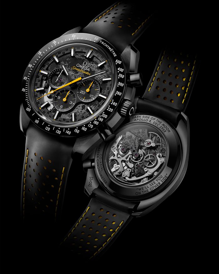 Dieses 44,25-mm-Modell mit geschwärztem Uhrwerk, dessen Hauptplatine und Brücken zur Darstellung der Mondoberfläche per Laser bearbeitet wurden, ist eine Hommage an die Geschichte der Speedmaster an Bord der Mission Apollo 8. Die nahe Seite ist durch das skelettierte, schwarze, eloxierte Aluminiumzifferblatt zu sehen, die ferne Seite durch den Gehäuseboden.