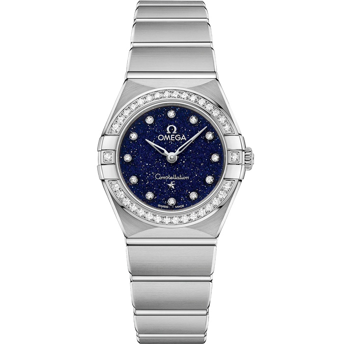 Dieses 25 mm große Modell aus Edelstahl verfügt über eine diamantbesetzte Lünette und ein blaues Zifferblatt aus Aventuringlas mit Diamantstundenmarkierungen. Die Zeiger, das OMEGA Logo, der Constellation-Stern und die Diamantfassungen sind aus 18K Weißgold.