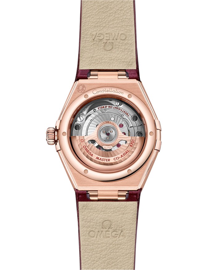 Dieses 29-mm-Modell aus 18 K Sedna™-Gold besitzt eine diamantbesetzte Lünette, ein perlfarbenes Perlmuttzifferblatt mit Diamantstundenindizes und ein Datumsfenster bei 6Uhr. Die Zeiger, das OMEGA Logo, der Constellation-Stern und die Diamantfassungen bestehen ebenfalls aus 18K Sedna™-Gold.