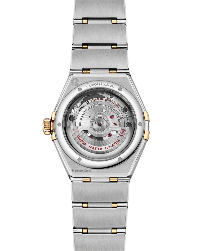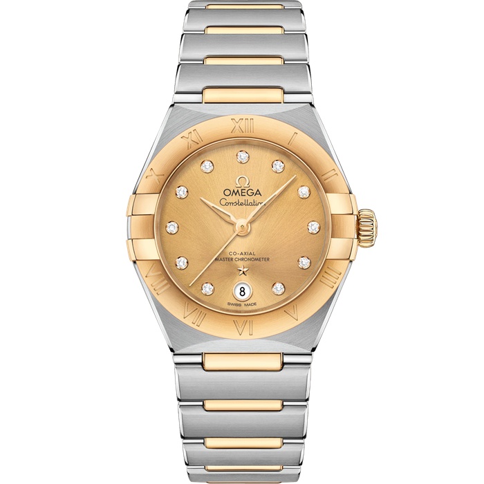 Dieses 29mm große Modell in 18 K Gelbgold und Edelstahl verfügt über eine mit römischen Ziffern gravierte Lünette, ein champagnerfarbenes Zifferblatt mit Sonnenschliff und Diamantstundenmarkierungen sowie ein Datumsfenster bei 6Uhr. Die Zeiger, das OMEGA Logo, der Constellation-Stern und die Diamantfassungen sind ebenfalls aus 18K Gelbgold.