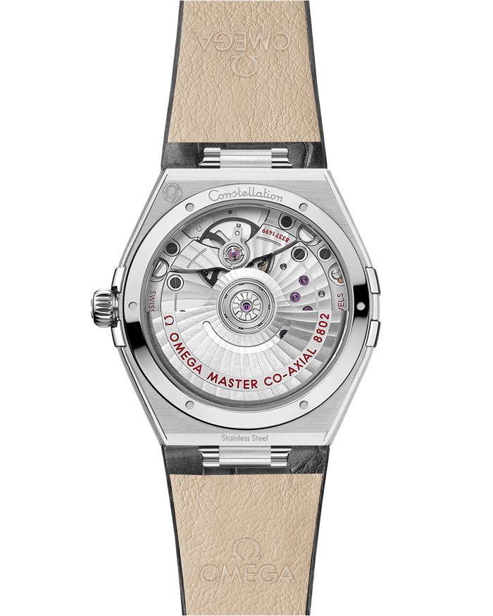 Dieses 34 mm große Modell aus Edelstahl verfügt über eine mit römischen Ziffern gravierte Lünette, ein silberweißes Zifferblatt und ein rundes Datumsfenster bei 6 Uhr. Die polierten Stundenindizes, die Zeiger, das OMEGA Logo und der Constellation-Stern wurden aus 18 K Weißgold gefertigt, während das Hilfszifferblatt für die kleine Sekunde und der zentrale Minutenring von Ringen umrahmt sind.