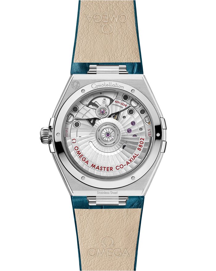 Dieses 34 mm große Modell aus Edelstahl verfügt über eine mit römischen Ziffern gravierte Lünette, ein pfauenblaues Zifferblatt mit Sonnenschliff und ein rundes Datumsfenster bei 6 Uhr. Die zulaufenden Diamantstundenindizes verfügen über Fassungen aus 18 K Weißgold. Das Hilfszifferblatt für die kleine Sekunde und der zentrale Minutenring sind von Ringen umrahmt. Die Zeiger, das OMEGA Logo und der Constellation-Stern wurden ebenfalls aus 18 K Weißgold gefertigt.