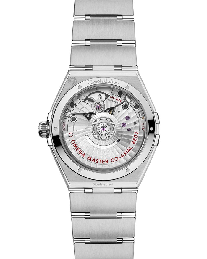 Dieses 34 mm große Modell aus Edelstahl verfügt über eine mit römischen Ziffern gravierte Lünette, ein pfauenblaues Zifferblatt mit Sonnenschliff und ein rundes Datumsfenster bei 6Uhr. Die zulaufenden Diamantstundenindizes verfügen über Fassungen aus 18 K Weißgold. Das Hilfszifferblatt für die kleine Sekunde und der zentrale Minutenring sind von Ringen umrahmt. Die Zeiger, das OMEGA Logo und der Constellation-Stern wurden ebenfalls aus 18K Weißgold gefertigt.