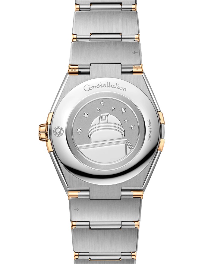 Dieses 36 mm große Modell in Edelstahl und 18 K Gelbgold verfügt über eine mit römischen Ziffern gravierte Lünette, ein opalisierend versilbertes Zifferblatt und ein Datumsfenster bei 6Uhr. Die Zeiger, das OMEGA Logo, der Constellation-Stern und die Indizes sind allesamt aus 18K Gelbgold.