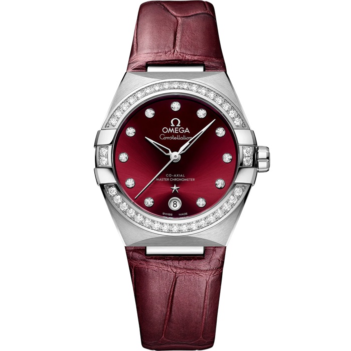 Dieses 36-mm-Modell aus Edelstahl besitzt eine polierte, mit 38 Diamanten besetzte Lünette, ein Zifferblatt mit burgunderroter PVD-Beschichtung und Sonnenschliff sowie ein Datumsfenster bei 6 Uhr. Die Zeiger, das OMEGA Logo, der Constellation-Stern und die Indizes sind allesamt aus 18 K Weißgold.