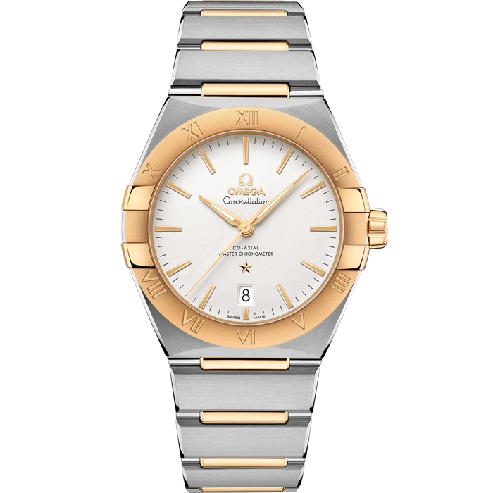 Dieses 39 mm große Modell in Edelstahl und 18 K Gelbgold verfügt über eine mit römischen Ziffern gravierte Lünette, ein opalweißes versilbertes Zifferblatt und ein Datumsfenster bei 6Uhr. Die Zeiger, das OMEGA Logo, der Constellation-Stern und die Indizes sind allesamt aus 18K Gelbgold.