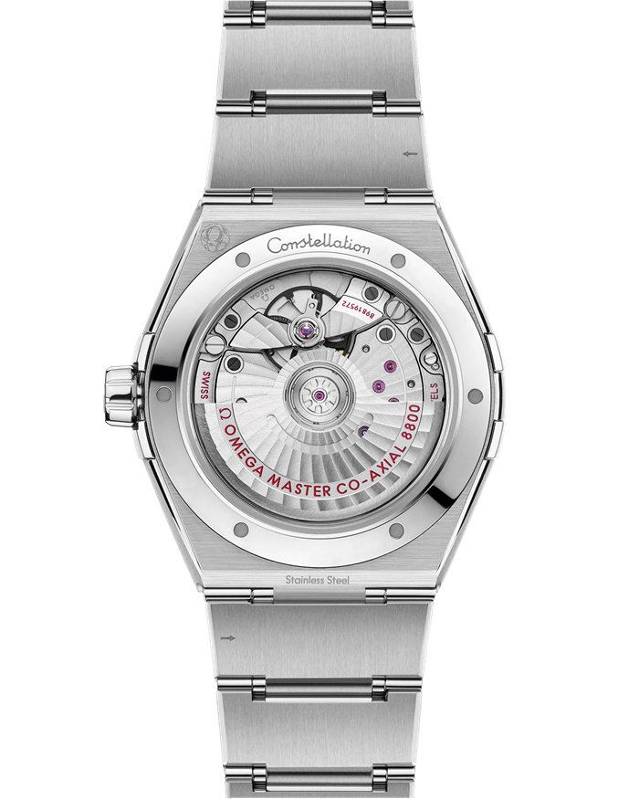 Dieses 39 mm große Modell in Edelstahl verfügt über eine mit römischen Ziffern gravierte Lünette, ein schwarzes Zifferblatt mit Sonnenschliff und ein Datumsfenster bei 6Uhr. Die Zeiger, das OMEGA Logo, der Constellation-Stern und die Indizes sind allesamt aus 18K Weißgold.