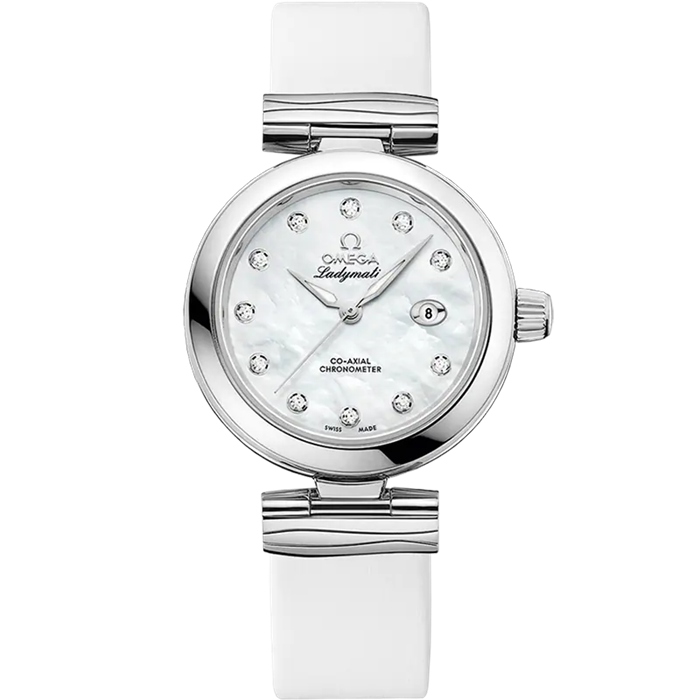 Bei diesem Modell wird das Edelstahlgehäuse über Befestigungsglieder mit Wellendekor mit einem weißen Lederarmband verbunden, und die polierten alphaförmigen Zeiger sind wie die 11 diamantbesetzten Indizes aus Weißgold gefertigt.