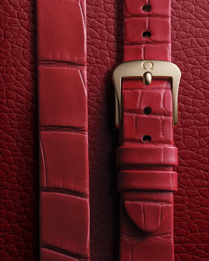 Dieses Modell aus 18 K Moonshine™-Gold besitzt ein 26-mm-Gehäuse mit einem elegant geschwungenen Diamantbesatz an jeder Seite. Die Krone ist mit einem einzelnen Diamanten besetzt, der von einer Blume aus roter Hybridkeramik umrahmt wird. Das gewölbte Zifferblatt wurde aus cremefarbenem „Grand Feu“-Email gefertigt und ist mit in Rot aufgedruckten römischen Ziffern versehen.