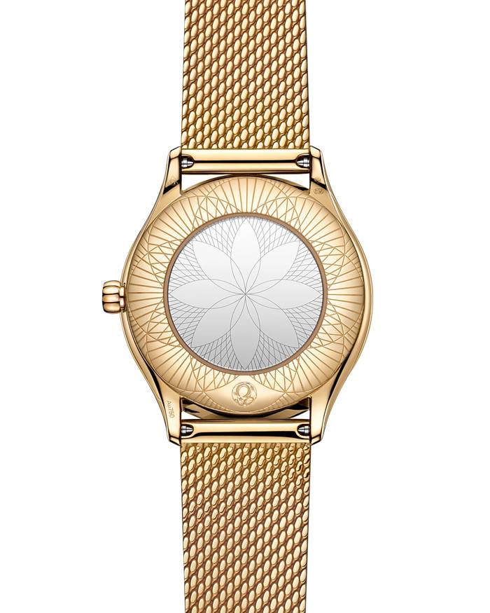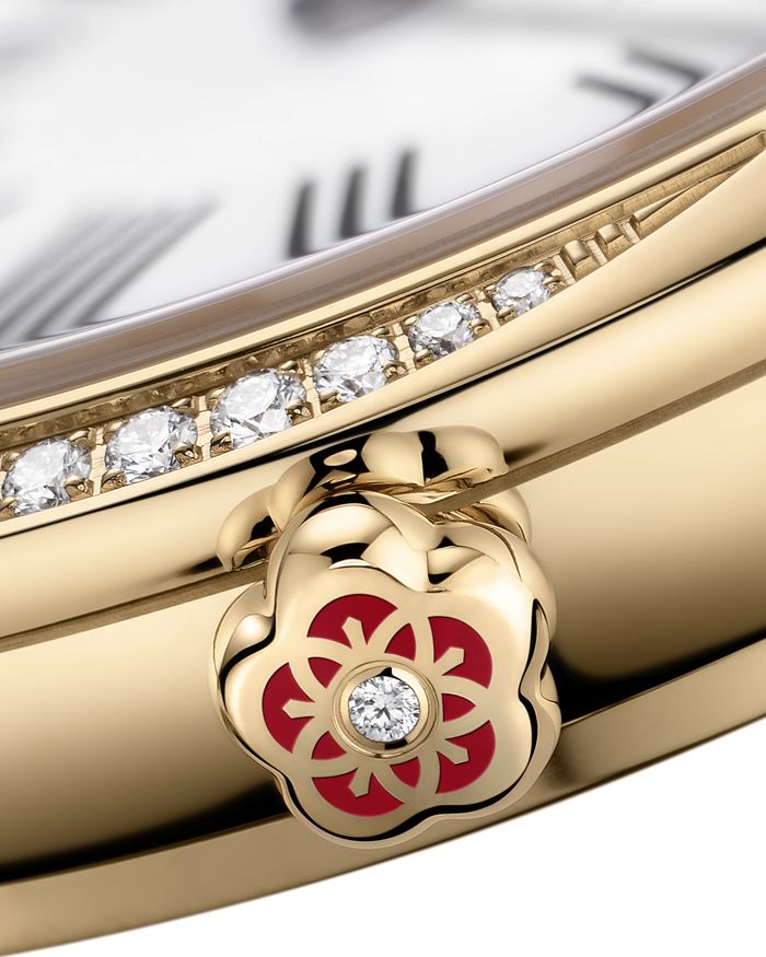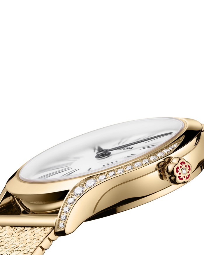 Dieses Modell aus 18 K Moonshine™-Gold besitzt ein 26-mm-Gehäuse mit einem elegant geschwungenen Diamantbesatz an jeder Seite. Die Krone ist mit einem einzelnen Diamanten besetzt, der von einer Blume aus roter Flüssigkeramik umrahmt wird. Das gewölbte Zifferblatt wurde aus cremefarbenem „Grand Feu“-Email gefertigt und ist mit geschwärzten Zeigern sowie aufgedruckten römischen Ziffern als Indizes versehen.