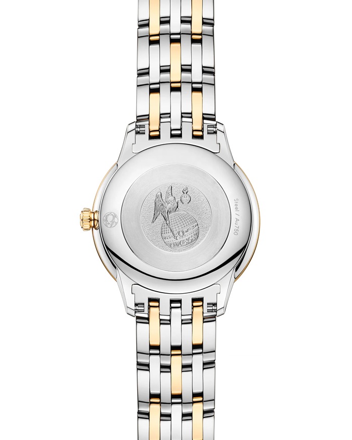 Dieses 27,5-mm-Modell aus Edelstahl und 18 K Gelbgold besitzt ein Zifferblatt mit PVD-Beschichtung aus Moonshine™-Gold und Sonnenschliff. Die Anzeige zeichnet sich durch mit Gelbgold vergoldete Zeiger sowie alternierende römische Ziffern und Cabochon-Indizes aus. Der schlichte Look des Zeitmessers wird durch einen soliden Gehäuseboden mit einer Prägung des Gottes Chronos ergänzt.