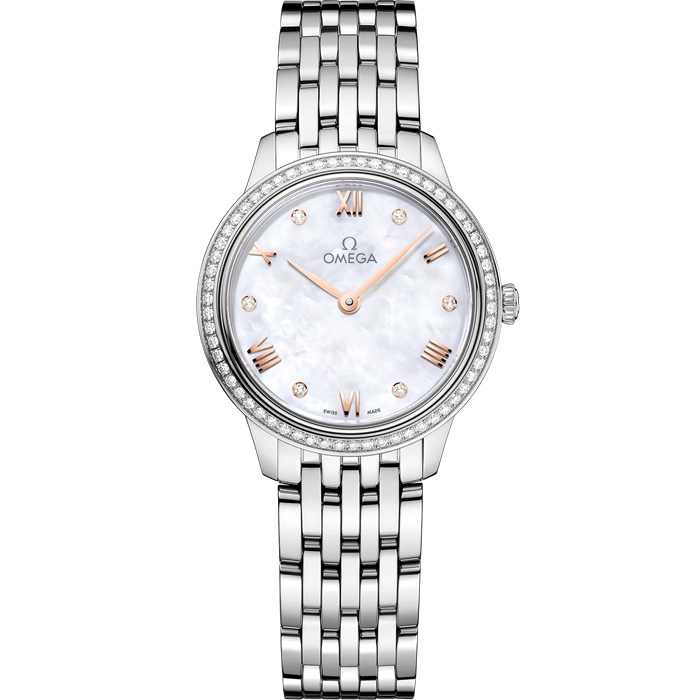 Dieses 27,5-mm-Modell aus Edelstahl besitzt eine diamantbesetzte Lünette und ein Zifferblatt aus weißem Perlmutt. Die Anzeige zeichnet sich durch Zeiger mit PVD-Beschichtung aus Sedna™-Gold sowie alternierende römische Ziffern und Diamantindizes in Halterungen aus 18 K Sedna™-Gold aus. Der schlichte Look des Zeitmessers wird durch einen soliden Gehäuseboden mit einer Prägung des Gottes Chronos ergänzt.