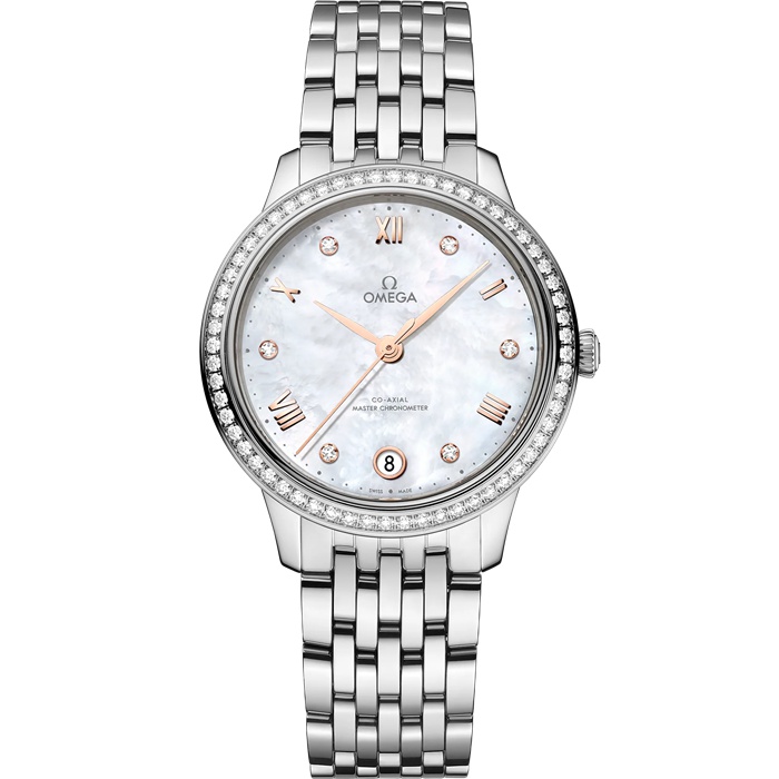Dieses 34-mm-Modell aus Edelstahl besitzt eine diamantbesetzte Lünette und ein Zifferblatt aus weißem Perlmutt. Die Anzeige zeichnet sich durch Zeiger mit PVD-Beschichtung aus Sedna™-Gold sowie alternierende römische Ziffern und Diamantindizes in Halterungen aus 18 K Sedna™-Gold aus.