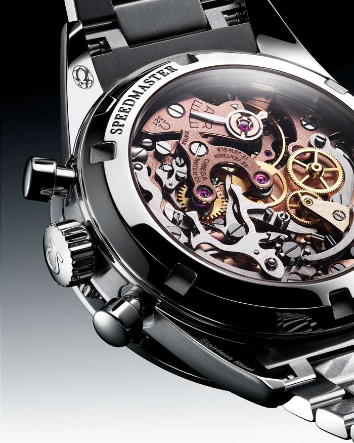 Das Edelstahlgehäuse mit einem Durchmesser von 39,70 mm schöpft seine Inspiration aus dem Stil der Speedmaster der 3. Generation, die während Amerikas erstem Weltraumspaziergang im Jahr 1965 getragen wurde. Außerdem besitzt der Zeitmesser einen Lünettenring aus polierter, schwarzer Keramik [ZrO2] mit einer Tachymeterskala aus weißem Email.