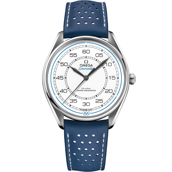 Auf dem Gehäuseboden befindet sich ein blauer eloxierter Aluminiumring, auf dem alle Austragungsorte und Termine der Olympischen Spiele mit Beteiligung von OMEGA verewigt wurden, von Los Angeles 1932 bis Los Angeles 2028.