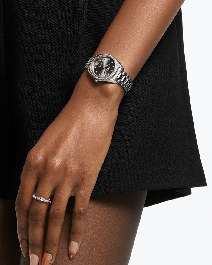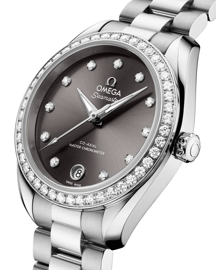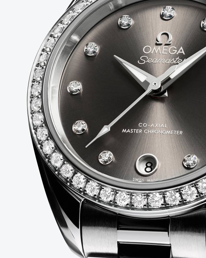 Das graue Zifferblatt wurde mit einem Sonnenschliff, einer PVD-Beschichtung und Lack versehen und weist ein kreisförmiges Datumsfenster bei 6 Uhr auf. Hervorgehoben wird es von elf Diamantstundenindizes und überarbeiteten, facettierten Zeigern, wobei der Minutenzeiger in einer zarten Spitze endet. Alle applizierten Elemente sowie die Zeiger wurden aus 18 K Weißgold gefertigt. Die Zeiger wurden außerdem mit weißer, im Dunkeln blau leuchtender Super-LumiNova gefüllt.