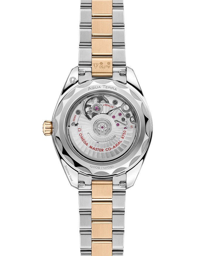 Das Modell besitzt ein symmetrisches, poliertes Gehäuse aus Edelstahl und 18 K Moonshine™-Gold und einen verschraubten Gehäuseboden mit Wellendekor.