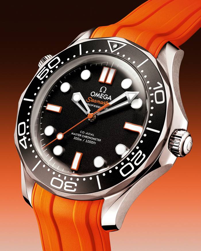 Schwarzes Aluminium wurde auch für das Zifferblatt verwendet, dessen rhodinierte, skelettierte Zeiger und Indizes ebenfalls mit weißer Super-LumiNova gefüllt sind. Für den zentralen Sekundenzeiger, die vier Viertelstundenindizes und den Namen Seamaster fiel die Wahl auf die Farbe Orange, das OMEGA Logo wurde in Weiß aufgedruckt.