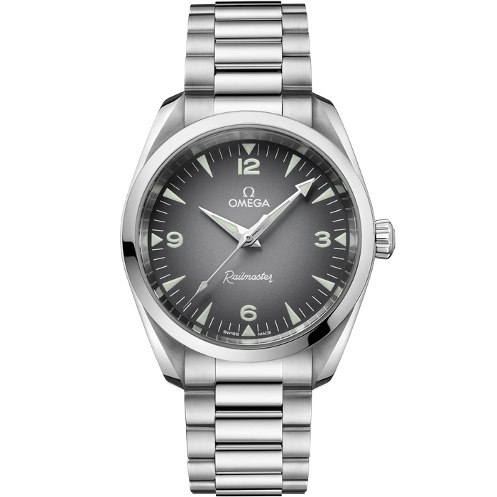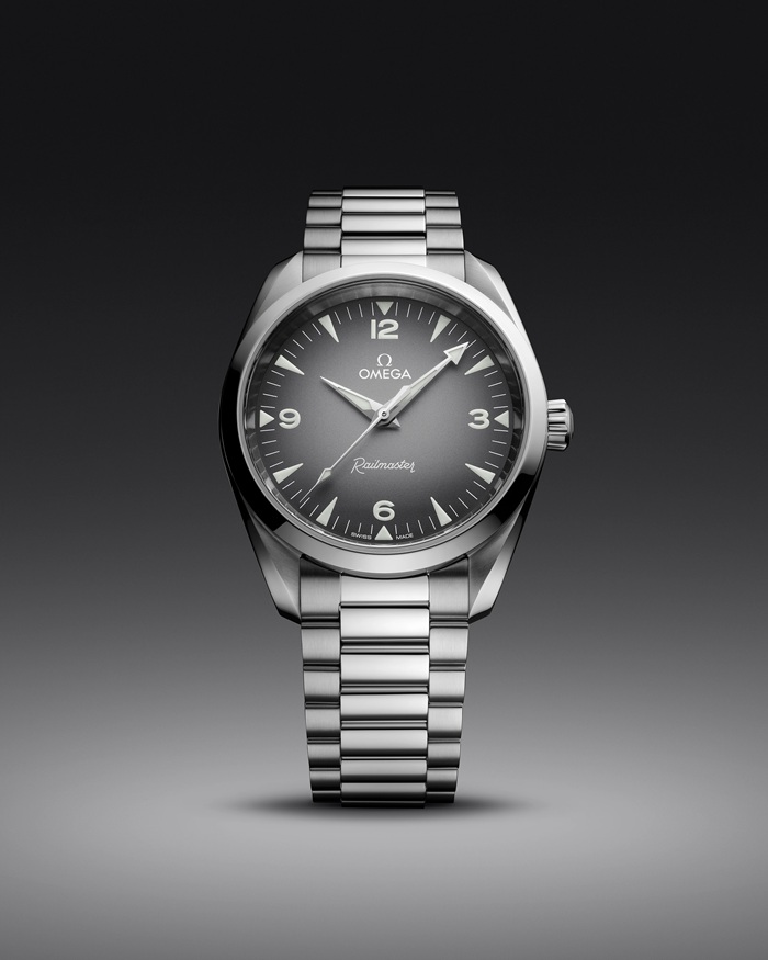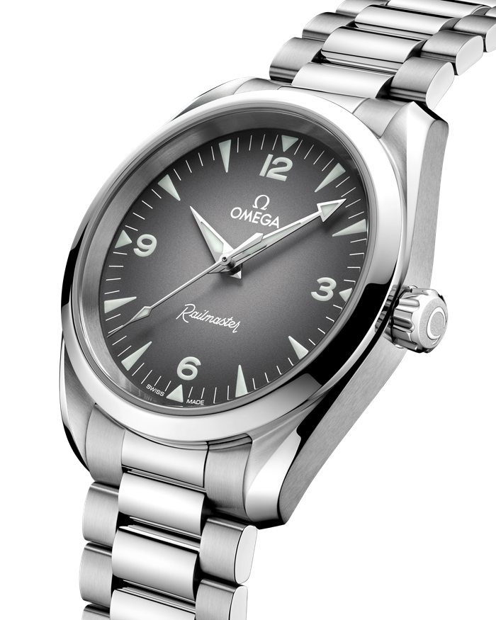 Das symmetrische 38-mm-Gehäuse ist gebürstet und poliert und wird von einem integrierten Armband mit Komfortverschluss sowie gebürsteten und polierten Gliedern am Handgelenk gehalten. In Anlehnung an die gut ablesbare Anzeige der Original Railmaster zeigt sich das Zifferblatt dieses Modells in Grau mit schwarzem Farbverlauf sowie mit großen Ziffern und Stundenindizes in weißer Super-LumiNova.