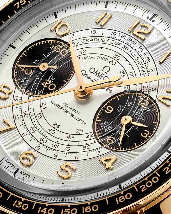Dieses 43-mm-Modell ist eine Hommage an die Olympischen Spiele Paris 2024 und präsentiert sich in den drei Hauptfarben des Events, Gold, Schwarz und Weiß. Der Zeitmesser ist aus 18 K Moonshine™-Gold gefertigt und besitzt ein opalisierend silberweißes Zifferblatt mit geschwärzten Hilfszifferblättern. Weiterhin verfügt die Uhr über einen Lünettenring aus schwarzer Keramik mit einer Tachymeterskala aus OMEGA Ceragold™, arabische Ziffern aus 18 K Moonshine™-Gold sowie mit PVD Moonshine™-Gold beschichtete Blattzeiger und Hilfszifferblätter-Zeiger.