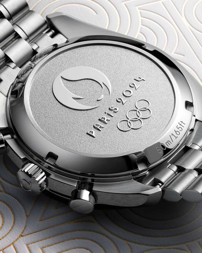 Auf der Rückseite präsentiert sich der Gehäuseboden aus Edelstahl mit einem geprägten Medaillon mit mattierter Basis, das mit einem hochglanzpolierten Paris-2024-Logo, dem Schriftzug „Paris 2024“ sowie den Olympischen Ringen verziert ist.