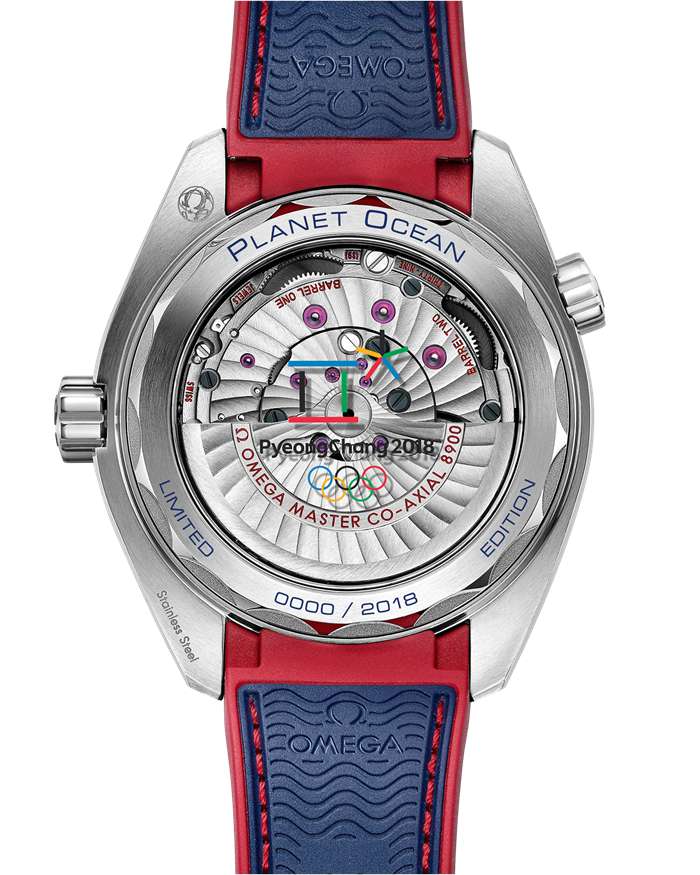 Der verschraubte Gehäuseboden wurde in Blau mit der Inschrift „PLANET OCEAN“ und „LIMITED EDITION“ sowie der Seriennummer der limitierten Auflage graviert. Das Saphirglas des Gehäusebodens ziert die Inschrift „PyeongChang 2018“ und das Logo der Olympischen Spiele.
