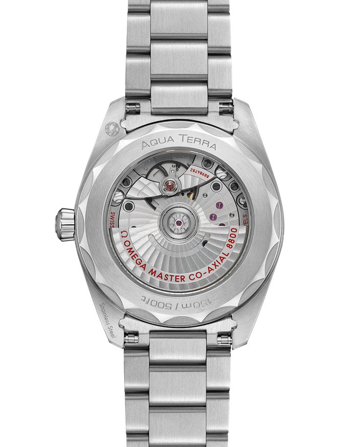 Die Seamaster Aqua Terra ist ein Tribut an OMEGAs großes maritimes Erbe. Das symmetrische Gehäuse dieses 38-mm-Modells besteht aus Edelstahl und ist auf der Rückseite mit einem Wellendekor versehen.