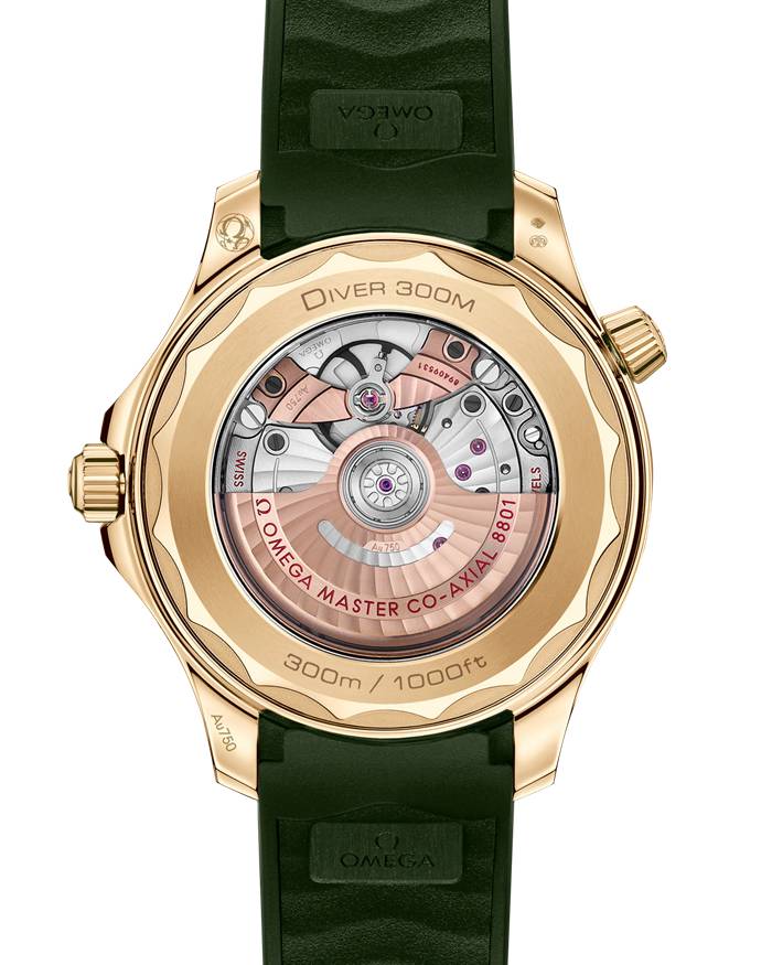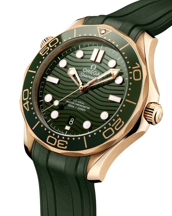 Dieses 42-mm-Modell aus 18 K Moonshine™-Gold besticht durch eine grüne Keramiklünette mit einer Tauchskala aus Ceragold™. Das Zifferblatt besteht ebenfalls aus polierter grüner Keramik und verfügt ferner über lasergravierte Wellen und ein Datumsfenster bei 6 Uhr.