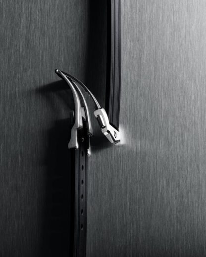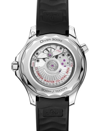 Schwarzes Aluminium wurde auch für das Zifferblatt verwendet, das per Laser mit dem ikonischen Wellenmuster der Diver graviert wurde. Die skelettierten Zeiger und Indizes sind rhodiniert und mit weißer Super-LumiNova gefüllt, während die anderen Markierungen, darunter das OMEGA Logo, in Weiß aufgedruckt wurden.