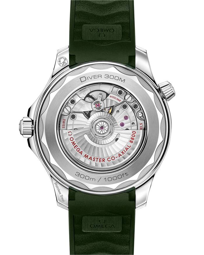 Dieses 42-mm-Modell aus Edelstahl besticht durch eine grüne Keramiklünette mit einer Tauchskala aus weißem Email. Das Zifferblatt besteht ebenfalls aus polierter grüner Keramik und verfügt ferner über lasergravierte Wellen und ein Datumsfenster bei 6 Uhr.