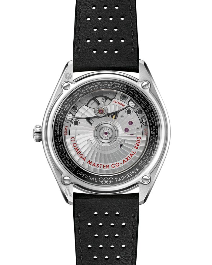 Auf dem Gehäuseboden befindet sich ein schwarzer eloxierter Aluminiumring, auf dem alle Austragungsorte und Termine der Olympischen Spiele mit Beteiligung von OMEGA verewigt wurden, von Los Angeles 1932 bis Los Angeles 2028.