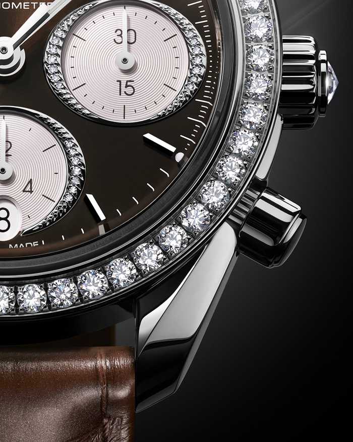Dieses Modell mit einem vollständig polierten Gehäuse aus Edelstahl besitzt eine mit 52 Diamanten besetzte Lünette und eine polierte Krone, in die ein einzelner Diamant gefasst wurde.