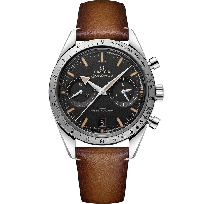 Die gebürstete Lünette ist mit einer geschwärzten Tachymeterskala versehen, während der Gehäuseboden die Gravur „Speedmaster ‘57“ aufweist. Das flache Saphirglas wurde beidseitig entspiegelt.