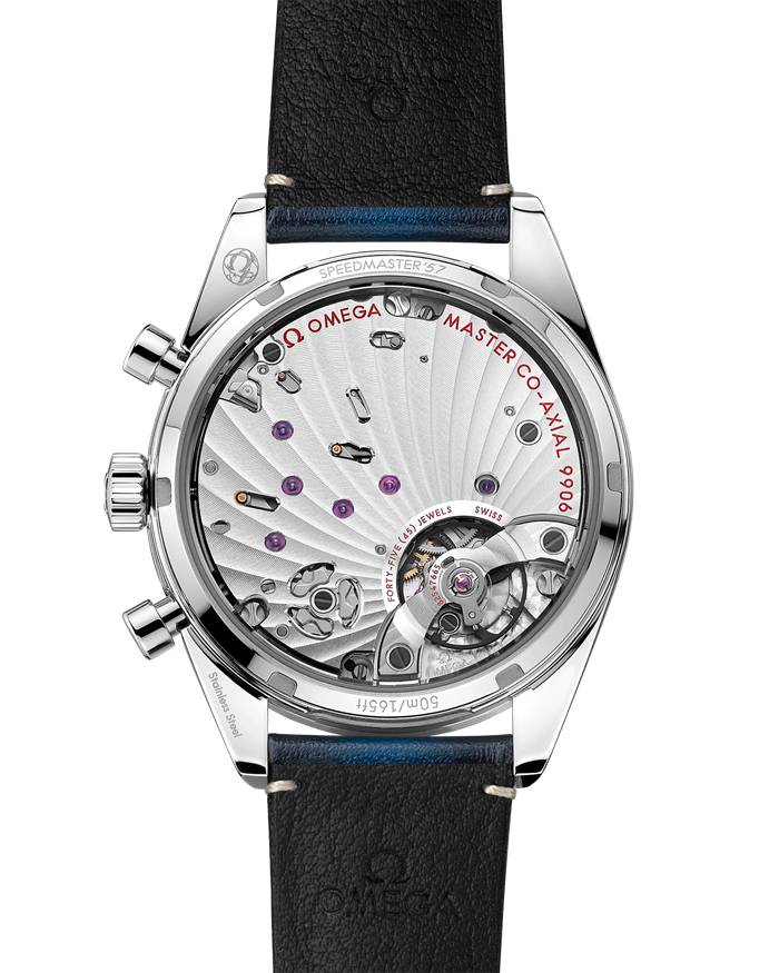Die gebürstete Lünette ist mit einer geschwärzten Tachymeterskala versehen, während der Gehäuseboden die Gravur „Speedmaster ‘57“ aufweist. Das flache Saphirglas wurde beidseitig entspiegelt.