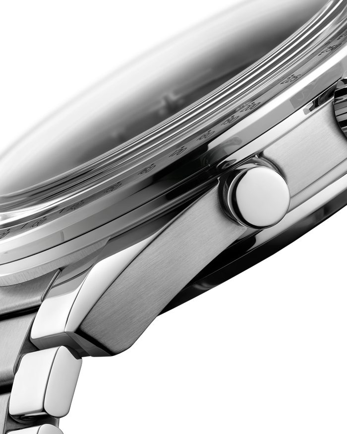 Dieses 40,5-mm-Modell, das von dem legendären Original aus dem Jahr 1957 inspiriert ist, besitzt ein Gehäuse aus Edelstahl und ein schwarzes Zifferblatt mit vertieften Stundenindizes und Vintage-Super-LumiNova. Neben den rhodinierten „Broad-Arrow“-Zeigern sind bei 6 Uhr ein Datumsfenster, bei 9 Uhr ein Hilfszifferblatt für die kleine Sekunde und bei 3 Uhr ein 12-Stunden- und ein 60-Minuten-Chronographenzähler zu sehen.