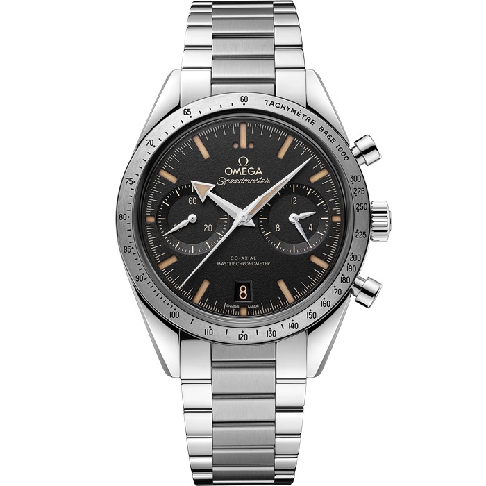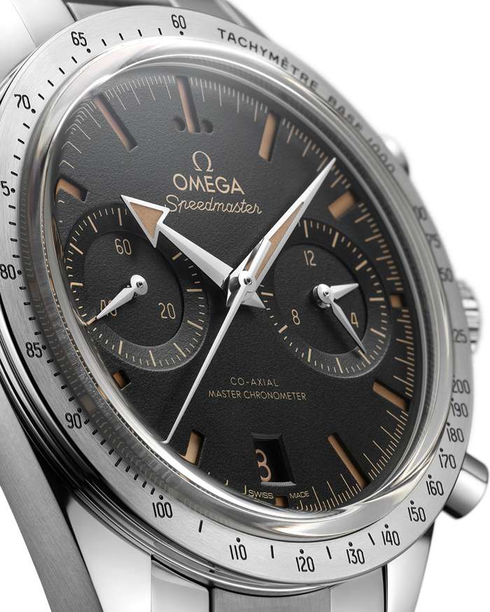 Die gebürstete Lünette ist mit einer geschwärzten Tachymeterskala versehen, während der Gehäuseboden die Gravur „Speedmaster ‘57“ aufweist. Das flache Saphirglas wurde beidseitig entspiegelt.