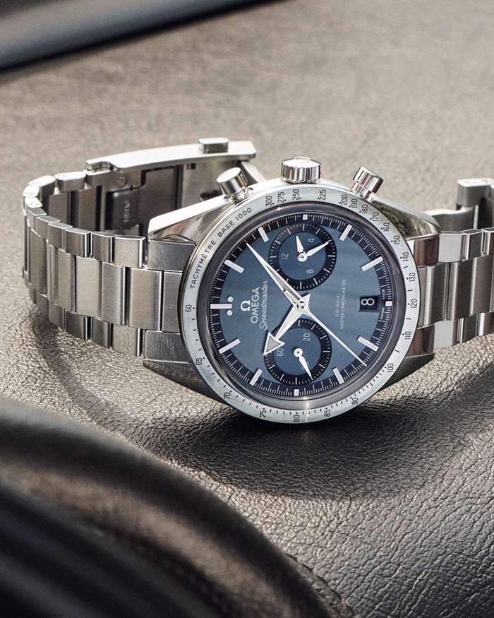 Die gebürstete Lünette ist mit einer geschwärzten Tachymeterskala versehen, während der Gehäuseboden die Gravur „Speedmaster ‘57“ aufweist. Das flache Saphirglas wurde beidseitig entspiegelt.