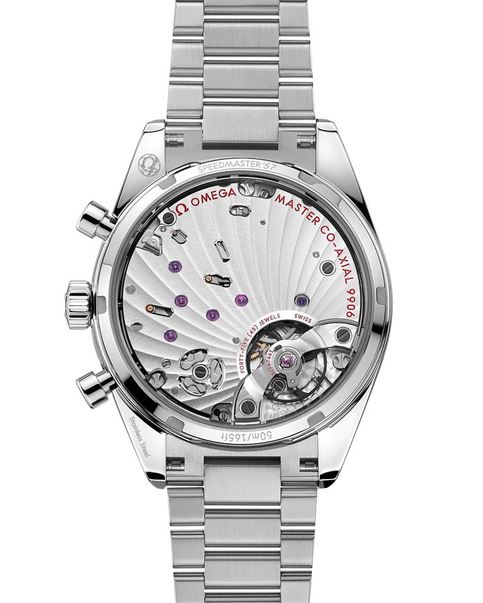 Die gebürstete Lünette ist mit einer geschwärzten Tachymeterskala versehen, während der Gehäuseboden die Gravur „Speedmaster ‘57“ aufweist. Das flache Saphirglas wurde beidseitig entspiegelt.