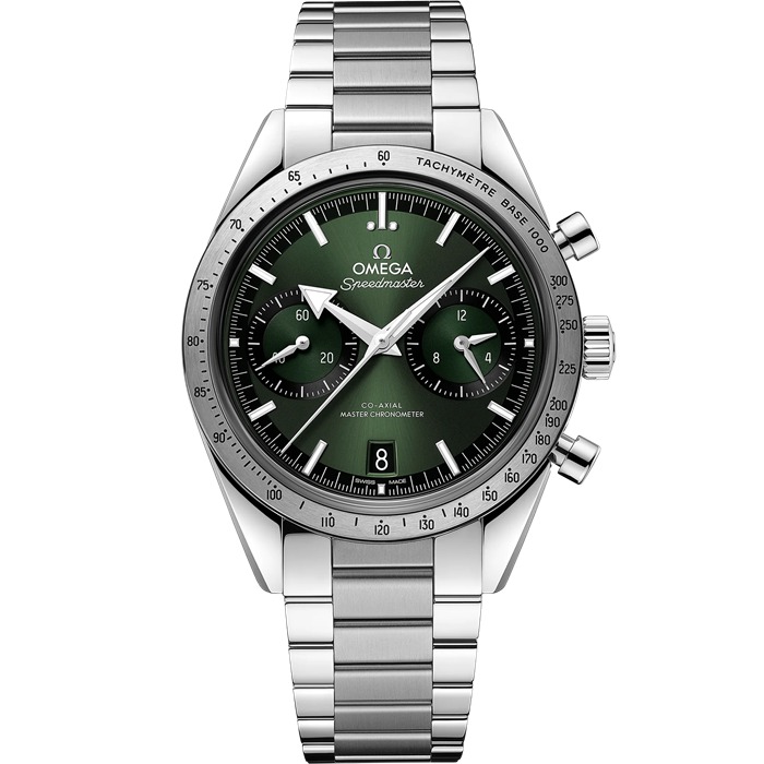 Dieses 40,5-mm-Modell, das von dem legendären Original aus dem Jahr 1957 inspiriert ist, besitzt ein Gehäuse aus Edelstahl und ein grünes Zifferblatt mit rhodinierten Stundenindizes und „Broad-Arrow“-Zeigern, die allesamt mit Super-LumiNova versehen sind. Bei 6 Uhr befindet sich ein Datumsfenster, bei 9 Uhr ein Hilfszifferblatt für die kleine Sekunde und bei 3 Uhr ein Hilfszifferblatt mit 12-Stunden- und 60-Minuten-Chronographenzählern.