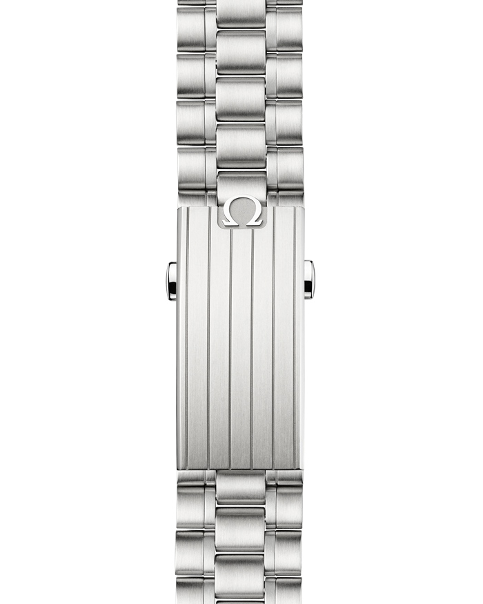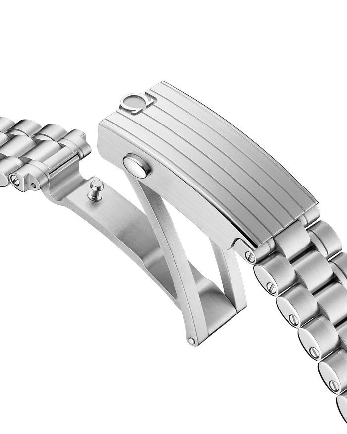 Das Armband dieser 42-mm-Moonwatch aus 18 K Canopus Gold™ weist ein Design mit fünf gebogenen Gliedern pro Reihe auf. Als Uhrglas und Gehäuseboden dient Saphirglas. Inspiriert von der 4. Generation der Speedmaster, die auf dem Mond getragen wurde, besitzt das Modell auch ein asymmetrisches Gehäuse, ein silberfarben abgestuftes Zifferblatt mit Sonnenschliff und den berühmten Punkt über der 90 auf dem Lünettenring aus eloxiertem Aluminium.