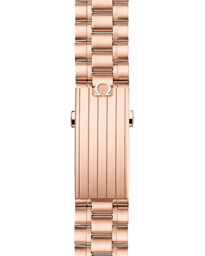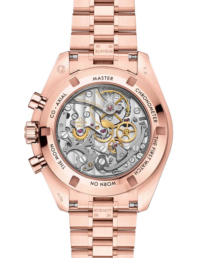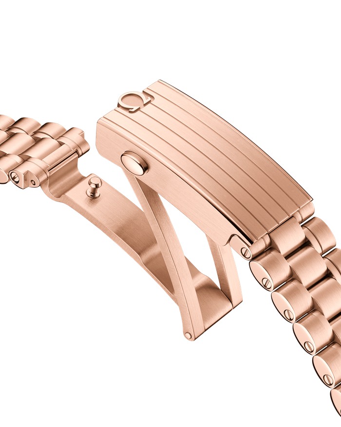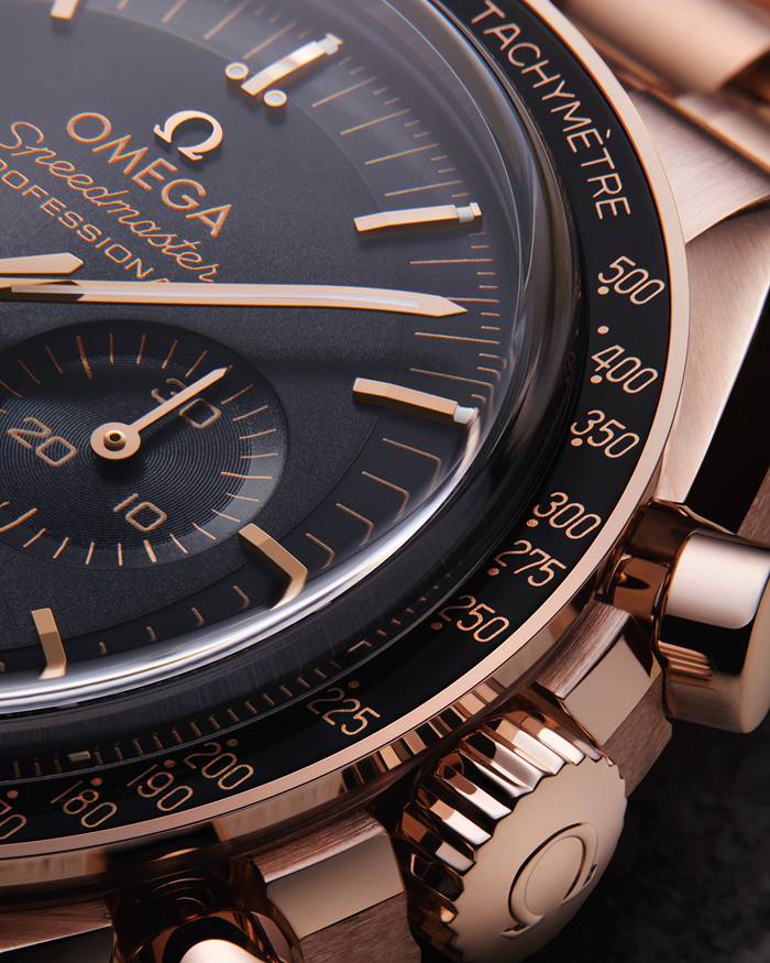 Das Armband dieser 42-mm-Moonwatch aus 18 K Sedna™-Gold weist ein Design mit fünf gebogenen Gliedern pro Reihe auf. Als Uhrglas und Gehäuseboden dient Saphirglas. Inspiriert von der 4. Generation der Speedmaster, die auf dem Mond getragen wurde, besitzt das Modell auch ein asymmetrisches Gehäuse, ein schwarz abgestuftes Zifferblatt und den berühmten Punkt über der 90 auf dem Lünettenring aus eloxiertem Aluminium.