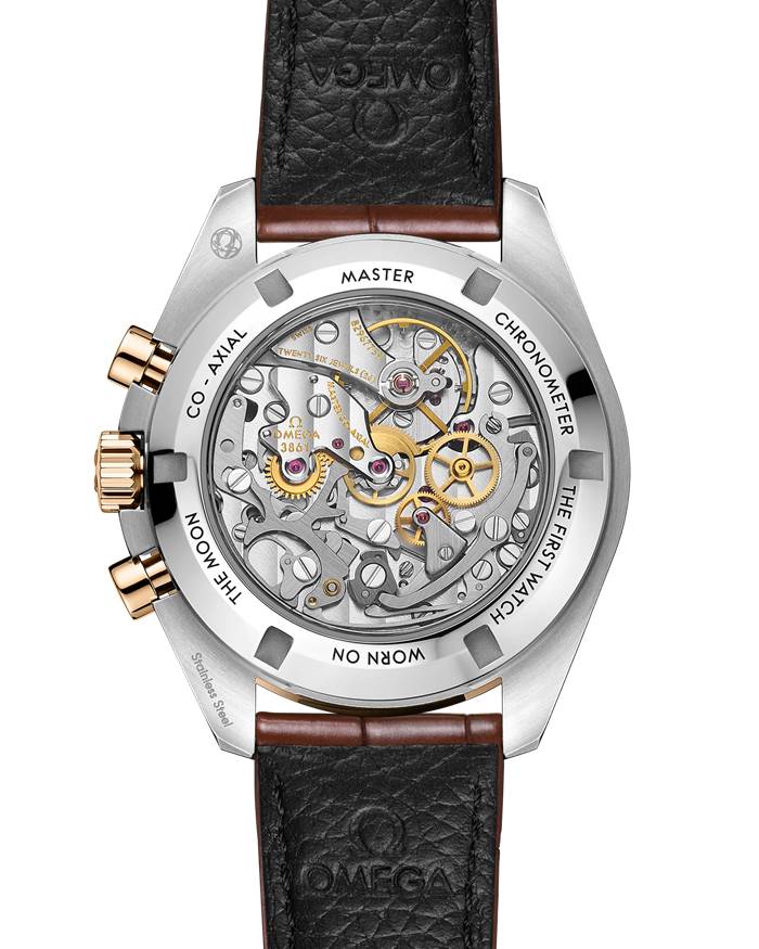Dieses 42-mm-Modell aus Edelstahl und 18 K Moonshine™-Gold ist sowohl auf der Vorder- als auch auf der Rückseite mit einem Saphirglas versehen. Es schöpft seine Inspiration aus der vierten Generation der Speedmaster und zeichnet sich durch ein asymmetrisches Gehäuse mit einem Lünettenring aus schwarzer Keramik, eine Tachymeterskala aus OMEGA Ceragold™ und den berühmten „Punkt über der 90“ aus.