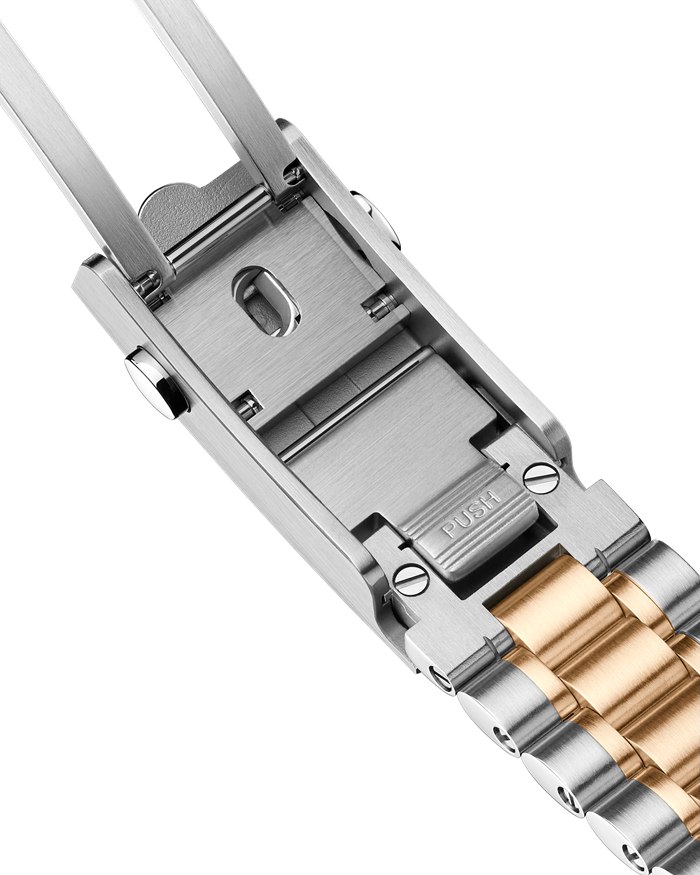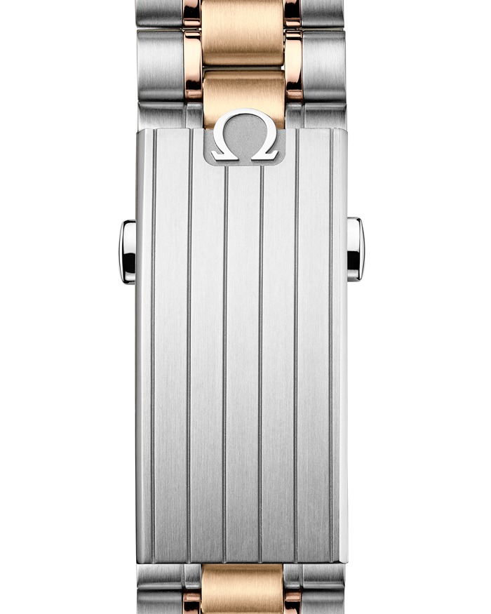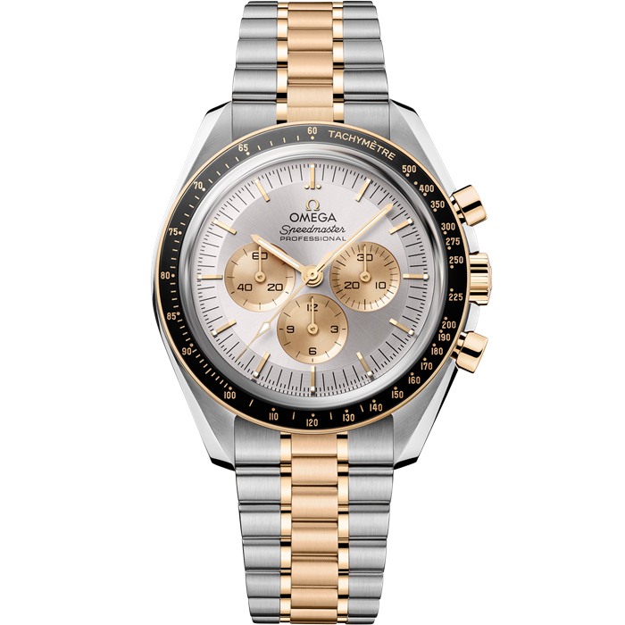 Dieses 42-mm-Modell aus Edelstahl und 18 K Moonshine™-Gold ist sowohl auf der Vorder- als auch auf der Rückseite mit einem Saphirglas versehen. Es schöpft seine Inspiration aus der vierten Generation der Speedmaster und zeichnet sich durch ein asymmetrisches Gehäuse mit einem Lünettenring aus schwarzer Keramik, eine Tachymeterskala aus OMEGA Ceragold™ und den berühmten „Punkt über der 90“ aus.