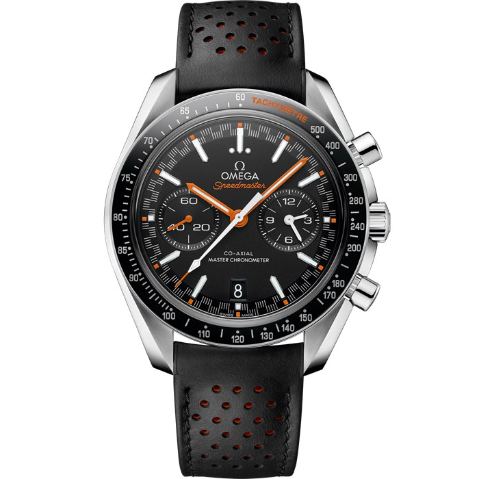 Dieses Speedmaster Racing Master Chronometer-Modell kennzeichnet ein 44,25-mm-Gehäuse aus Edelstahl mit einem Lünettenring aus schwarzer Keramik, der mit der berühmten Tachymeterskala mit orangefarbenem Schriftzug und Ziffern aus Liquidmetal™ versehen ist. Das schwarze Lederarmband verfügt über Mikroperforierungen, durch die die orangefarbene Kautschukfütterung zu sehen ist.