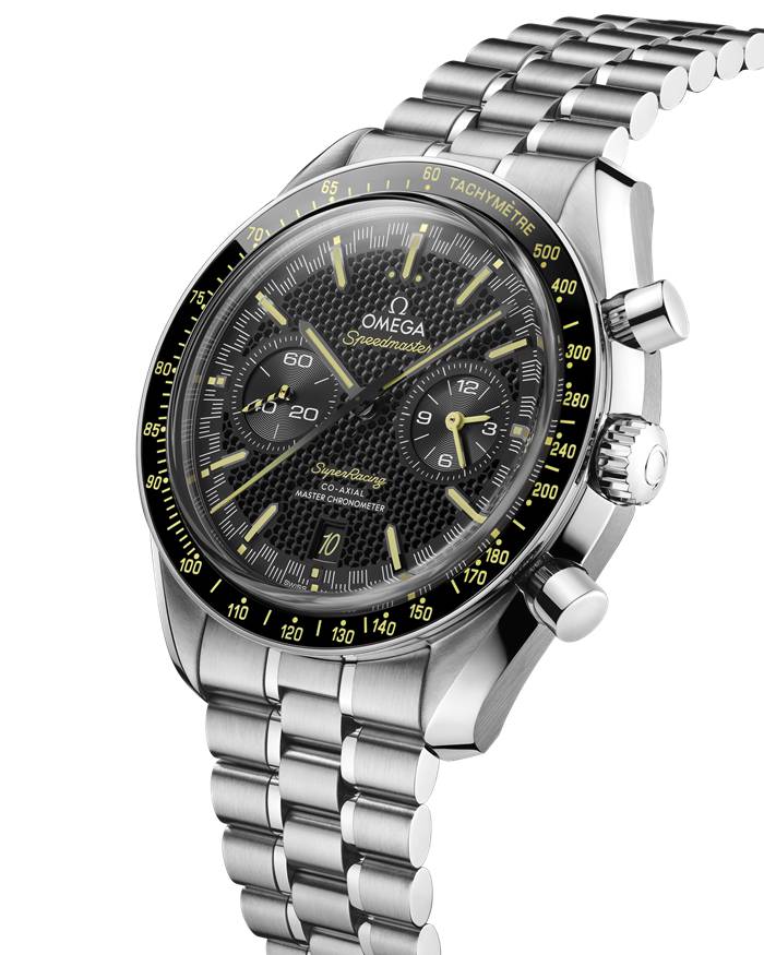Die diamantpolierten und abgeschrägten schwarzen Indizes mit Pfeilspitzen sind mit gelber Super-LumiNova gefüllt, die ein gelbes Leuchten erzeugt. Dieser Farbcode setzt sich auf den Schriftzügen Speedmaster und Super Racing auf dem Zifferblatt fort.