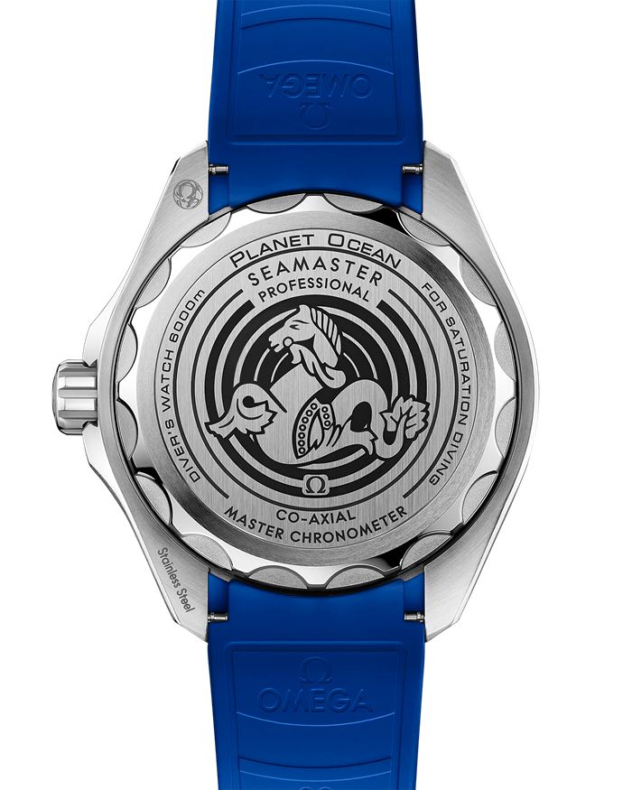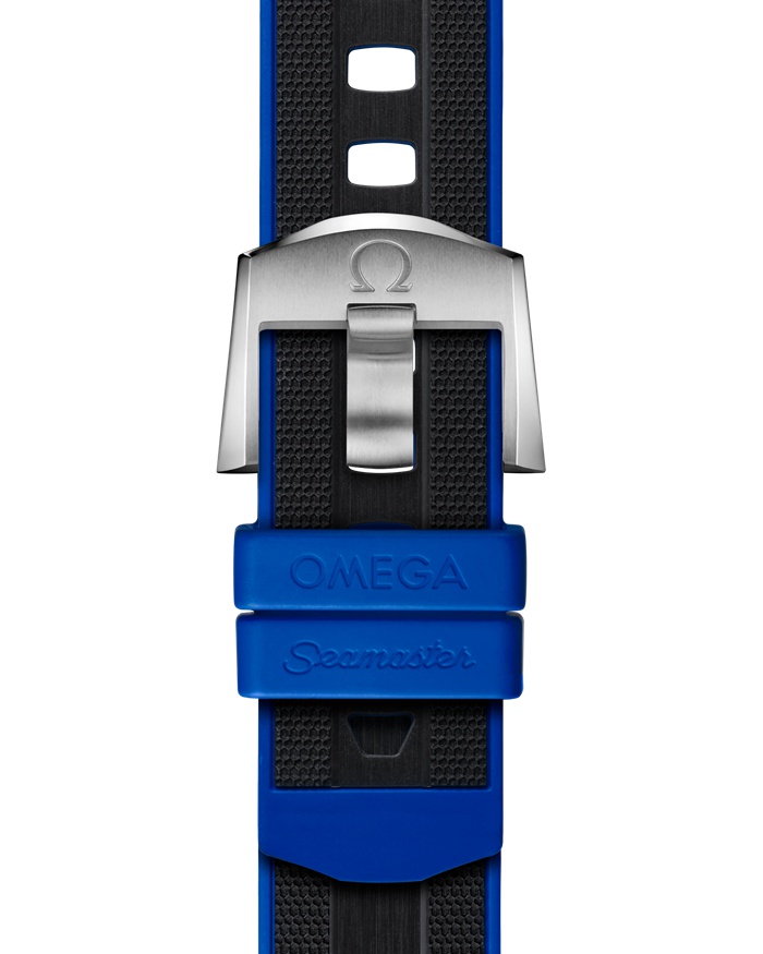 Dieses 45,5 mm große Modell aus robustem O-MEGASTEEL besitzt eine polierte blaue Keramiklünette mit einer Tauchskala aus weißem Email. Durch das hervorstehende, gewölbte Saphirglas ist ein weißes Zifferblatt mit vier arabischen Ziffern in Blau sowie Zeigern und Indizes aus 18 K Weißgold zu sehen, die mit weißer Super-LumiNova beschichtet sind.