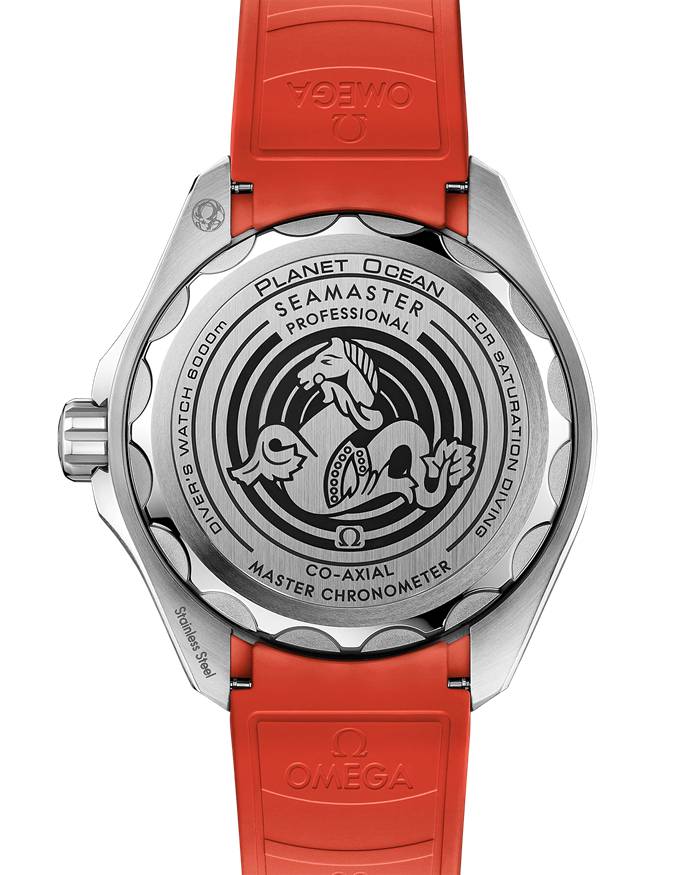 Dieses 45,5 mm große Modell aus robustem O-MEGASTEEL besitzt eine polierte orangefarbene Keramiklünette mit einer Tauchskala aus Flüssigkeramik und Super-LumiNova. Durch das hervorstehende, gewölbte Saphirglas ist ein lackiertes Zifferblatt mit einem Farbverlauf von Grau nach Schwarz, vier arabischen Ziffern in Orange sowie Zeigern und Indizes aus 18 K Weißgold zu sehen, die mit weißer Super-LumiNova beschichtet sind.