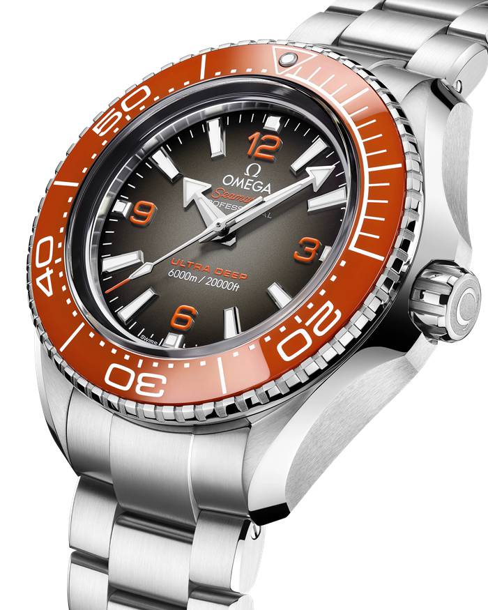 Dieses 45,5 mm große Modell aus robustem O-MEGASTEEL besitzt eine polierte orangefarbene Keramiklünette mit einer Tauchskala aus Flüssigkeramik und Super-LumiNova. Durch das hervorstehende, gewölbte Saphirglas ist ein lackiertes Zifferblatt mit einem Farbverlauf von Grau nach Schwarz, vier arabischen Ziffern in Orange sowie Zeigern und Indizes aus 18 K Weißgold zu sehen, die mit weißer Super-LumiNova beschichtet sind.